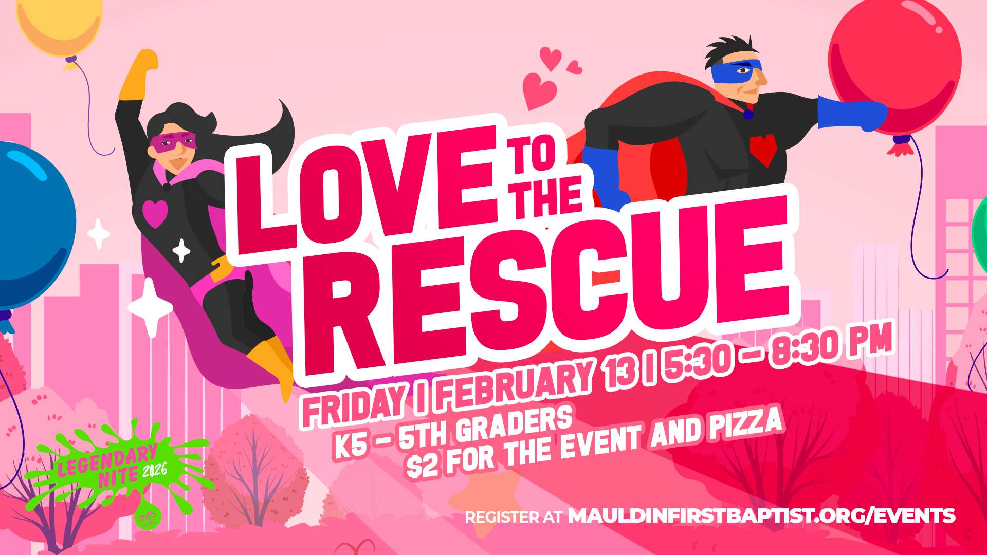 Calling all young heroes! Get ready for a night of high-energy fun, exciting games, and superhero-sized laughter at Legendary Nite: Love to the Rescue. This action-packed evening is designed just for K5–5th graders and will be filled with unforgettable moments and connection with friends.