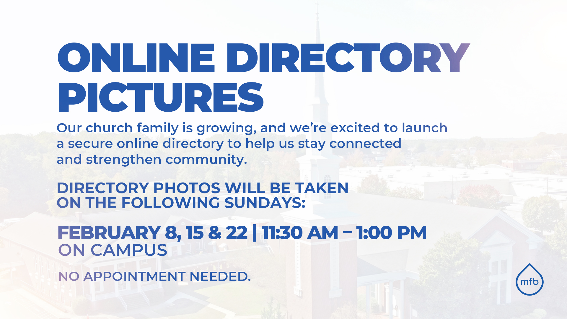 Our church family is growing, and we’re excited to launch a secure online directory to help us stay connected and strengthen community. Directory photos will be taken on campus on Sundays, February 8, 15, & 22 from 11:30 AM–1:00 PM. No appointment needed.