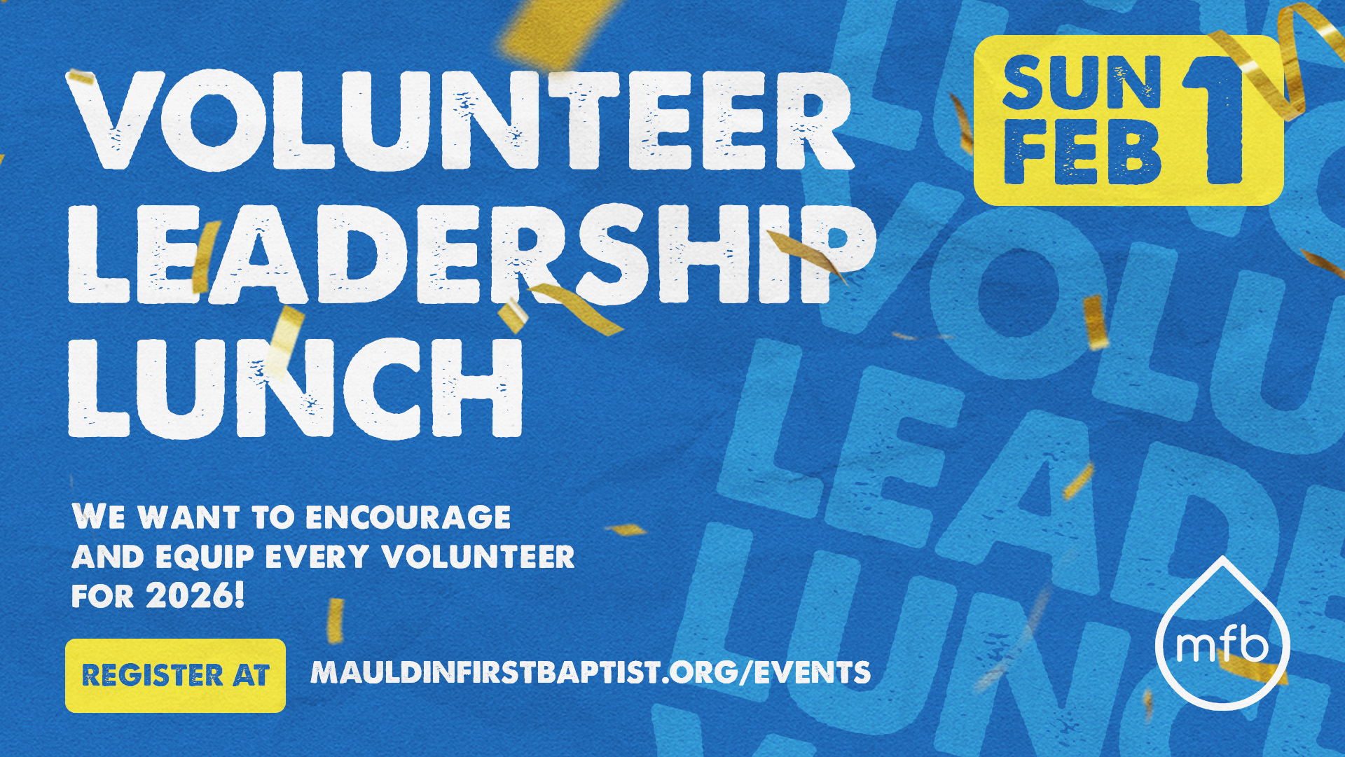 Join us on Sunday, February 1st for our Volunteer Leadership Lunch — a special time of encouragement, vision, and preparation for all volunteers at Mauldin First Baptist!
